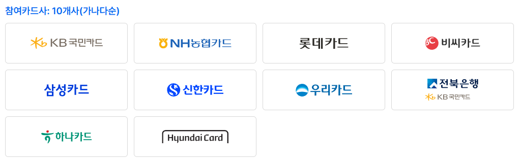 참여 카드사는 국민, 농협, 롯데, BC, 삼성, 신한 등이 있습니다.
