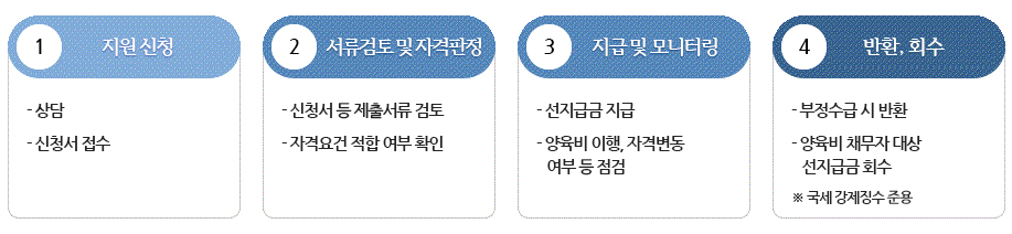온라인 신청: 양육비이행관리원 접속 → '양육비 선지급 신청' 메뉴 이용