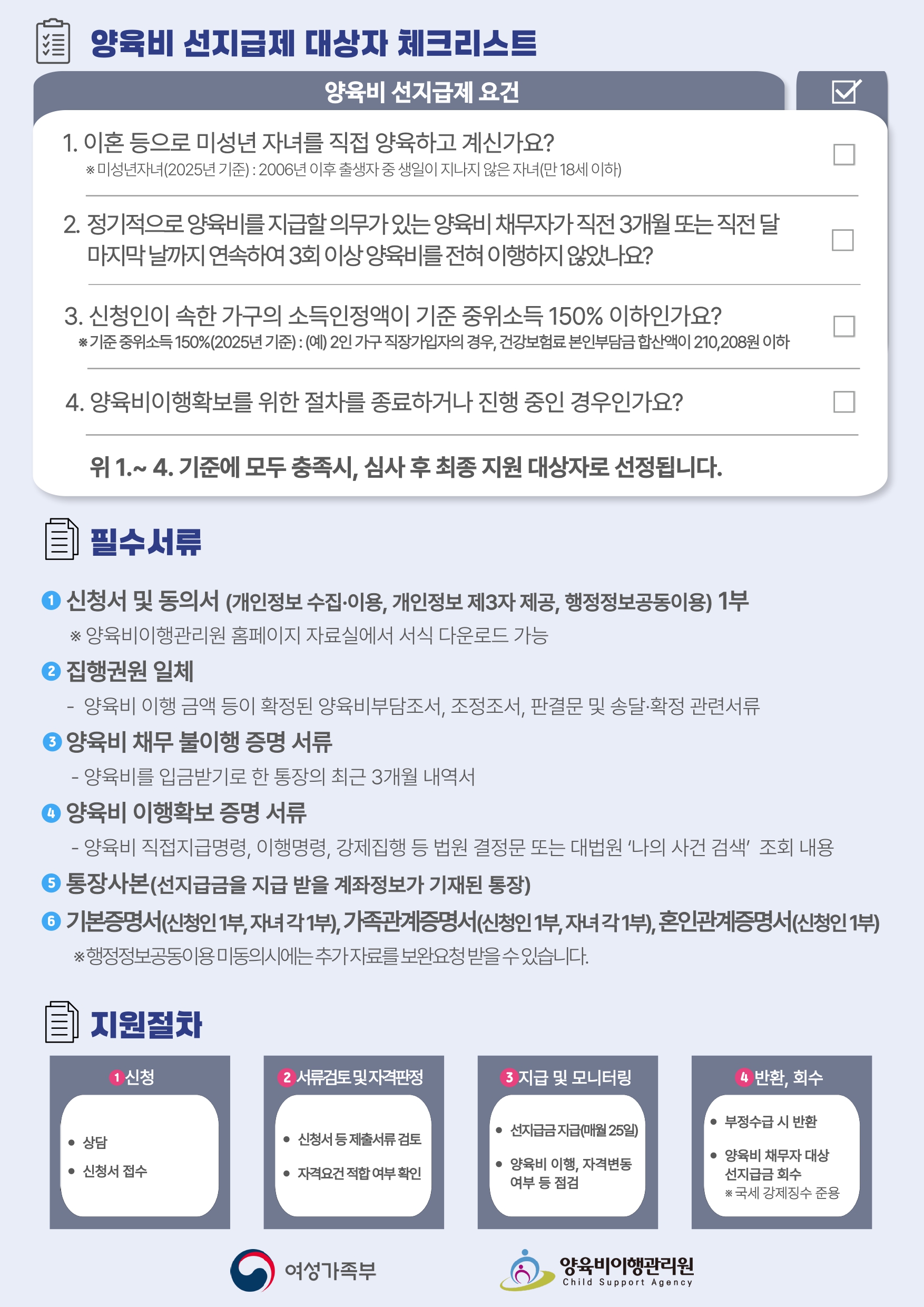 재판, 조정, 공정증서 등 법적으로 양육비를 정한 서류가 있어야 신청이 가능합니다.