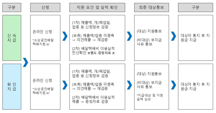 배달 및 택배비 지원사업은 두가지 유형(신속지급,확인지급)이 있고, 지금부터 무슨 유형이 맞는지 보시고 지원하시길 바랍니다.