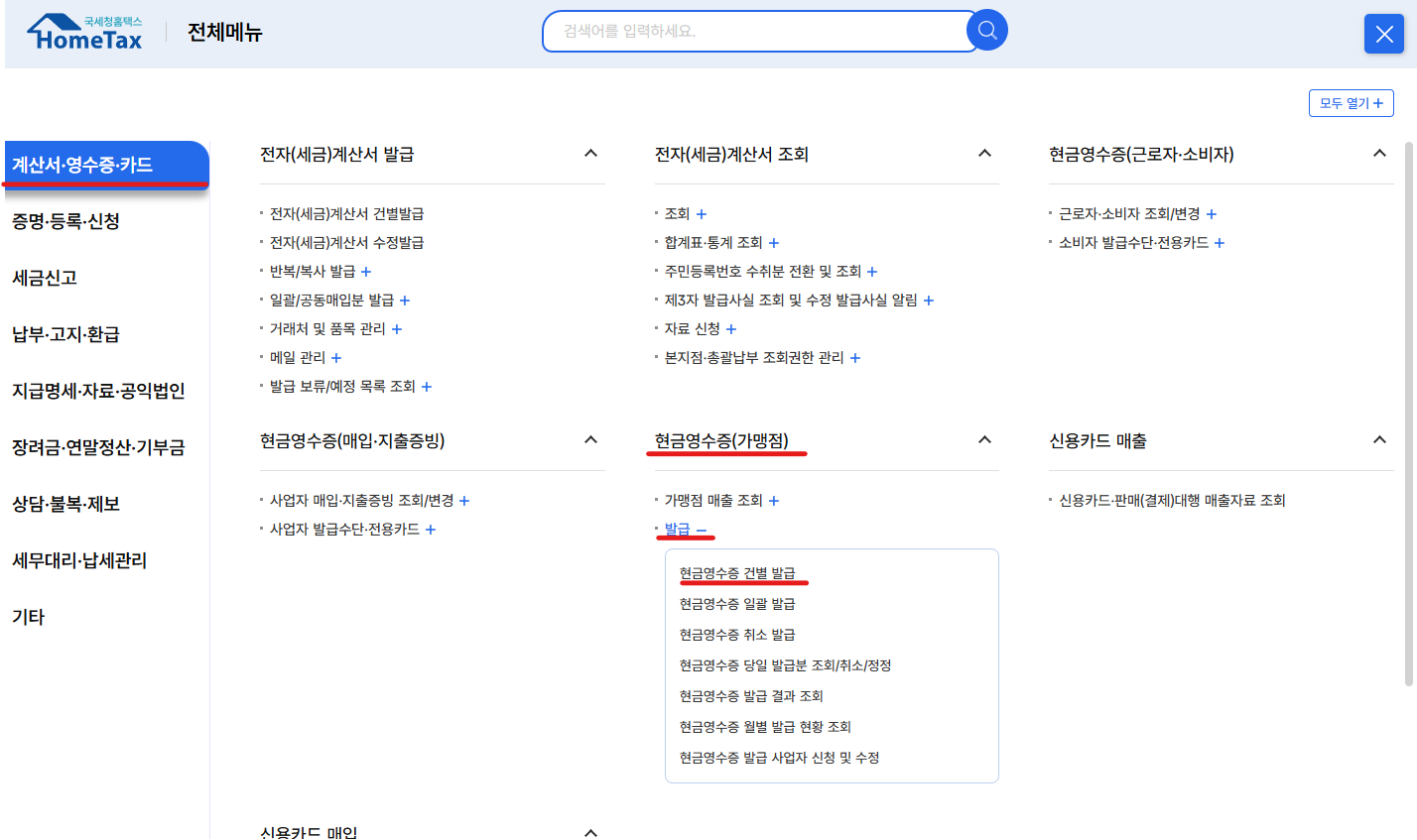 홈택스 로그인 후 메뉴에서 [계산서/영수증/카드] → [현금영주증(가맹점)] → [건별 발급] 선택 후 정보를 입력하소 자진발급 여부를 선택 후 완료하시면 됩니다.