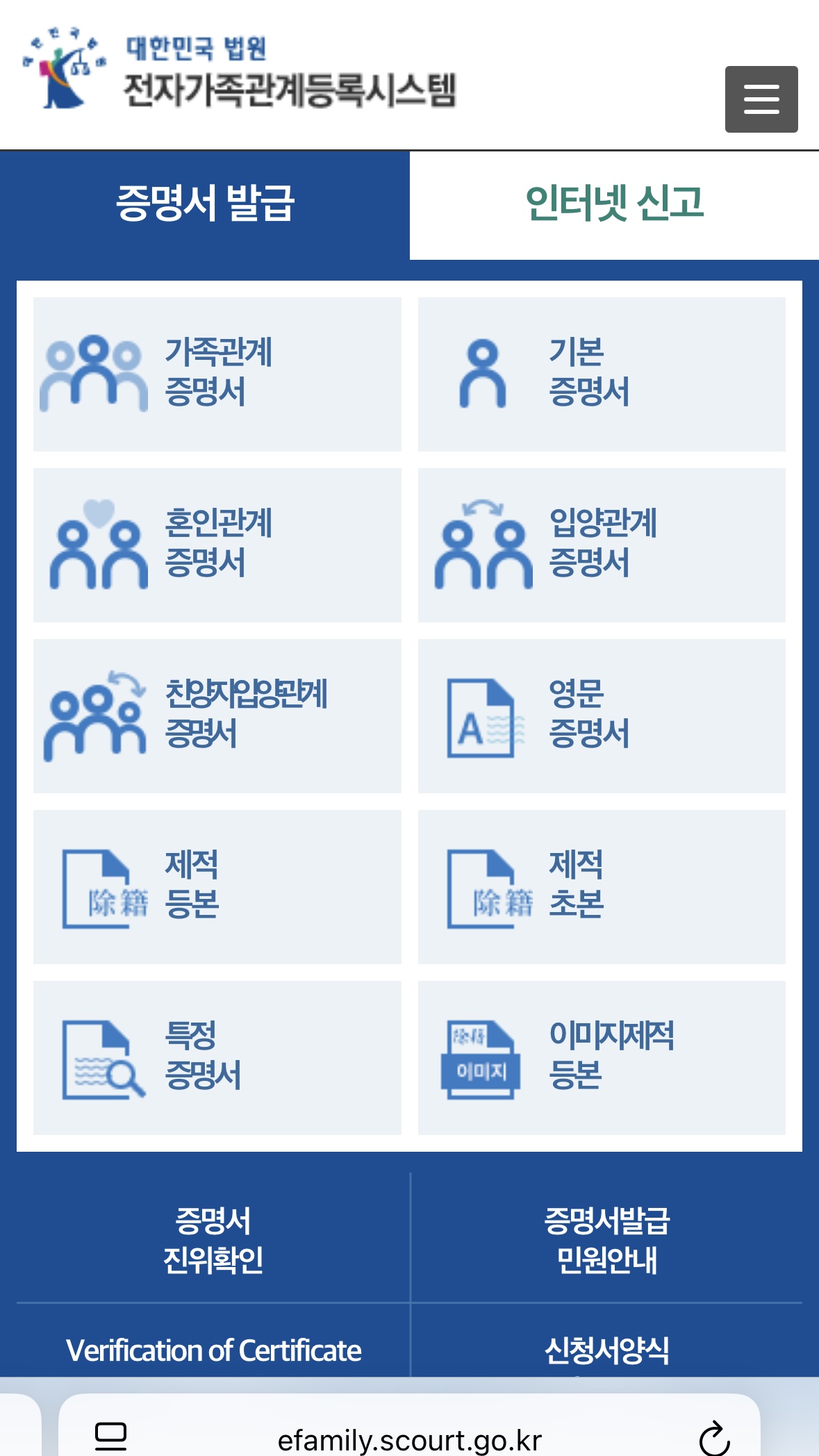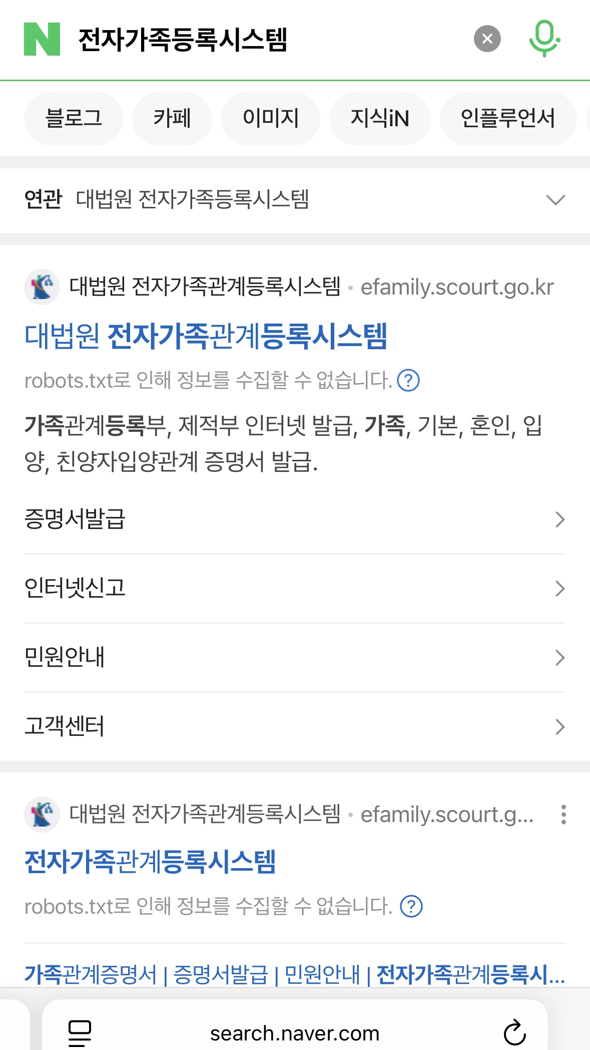 첫번째로는 모바일로 가족관계증명서를 발급 받으려면 먼저 검색창에 '전자가족관계등록시스템'이라고 검색 후 접속합니다. 접속하면 맨 처음에 보이는 페이지에서 가족관계증명서를 클릭 후 [이동하기] 버튼을 클릭합니다.