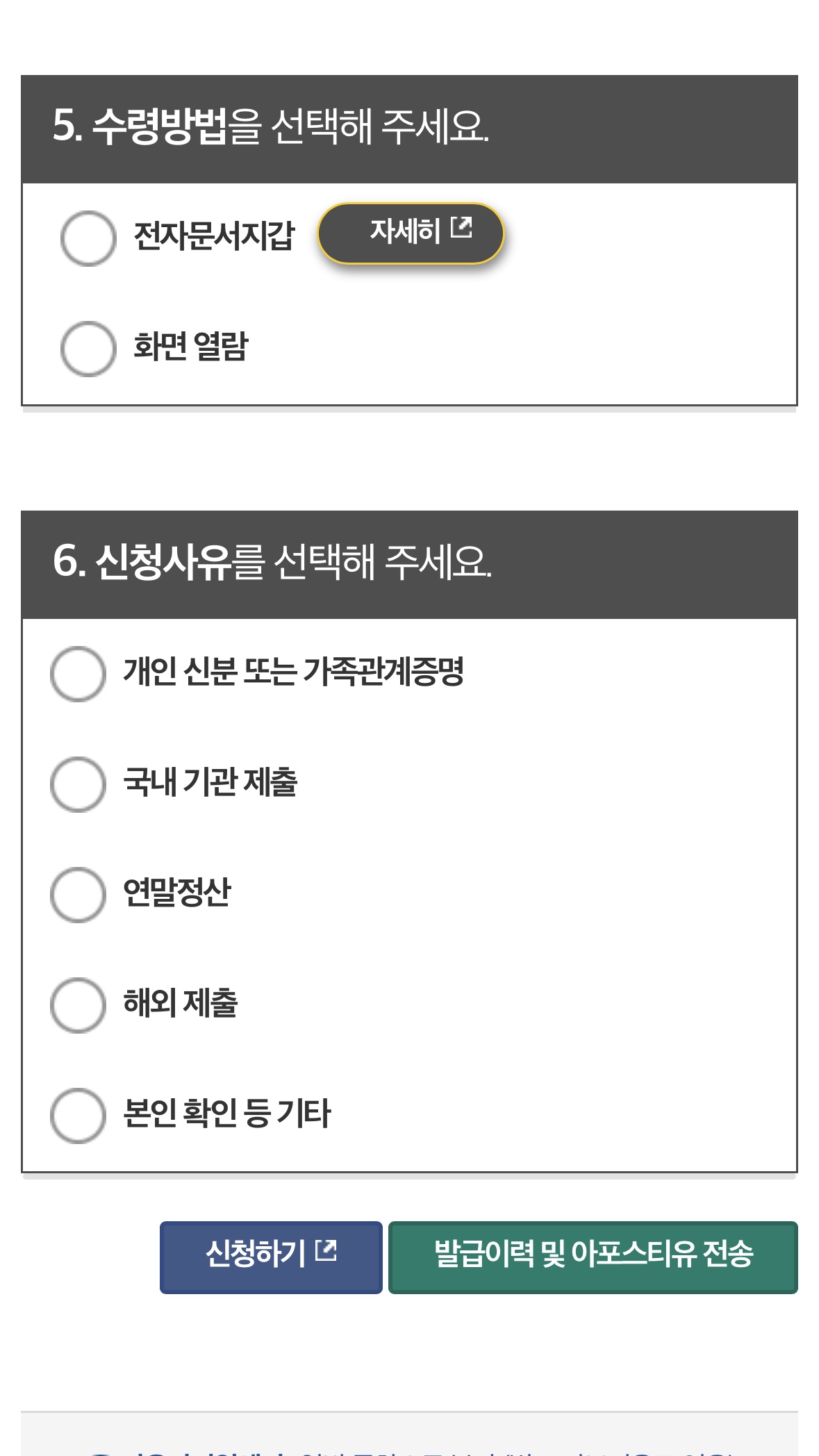 [이동하기]를 누르고 넘어간 페이지에서 신청인 정보 조회로 이동하고, 이용약관을 동의하면 전자문서를 신청할 수 있습니다.