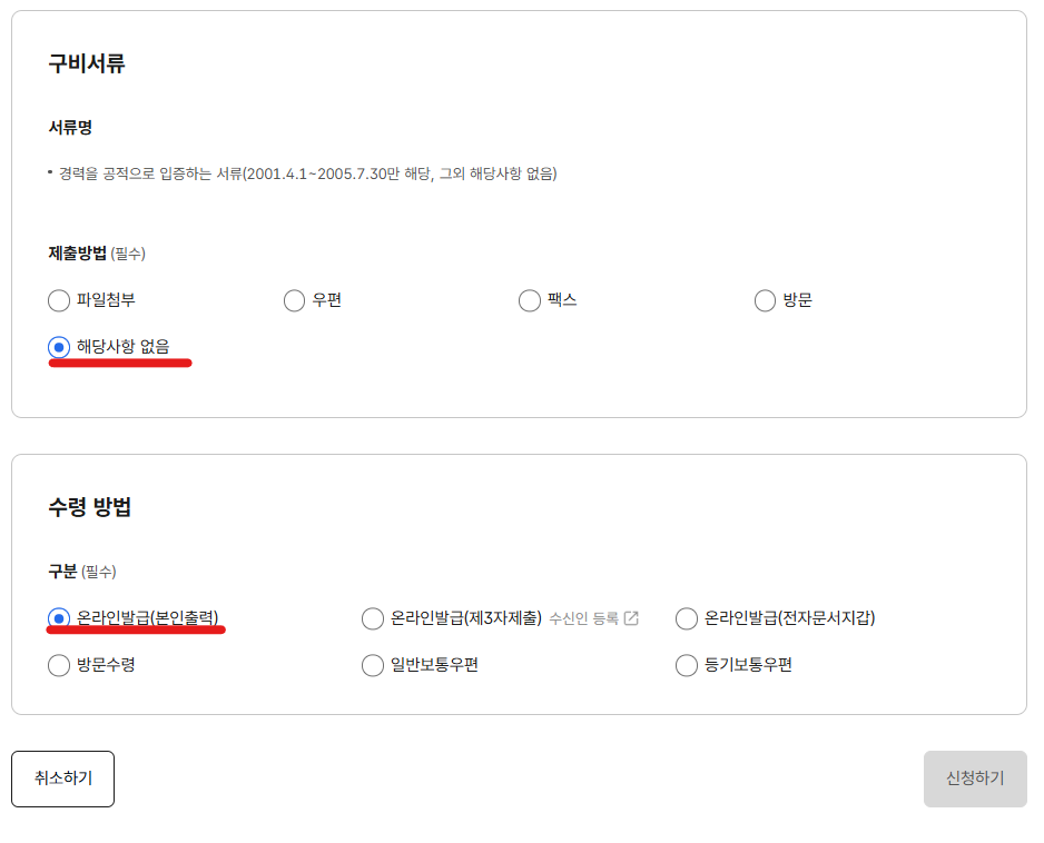 모든 내용을 기입한 뒤, 따로 제출할 구비서류가 없기 때문에 해당사항 없음으로 쳬크하고, 온라인발급(본인출력)을 누른 후 입력 정보에 오류가 없는지 확인하고 신청을 완료합니다.