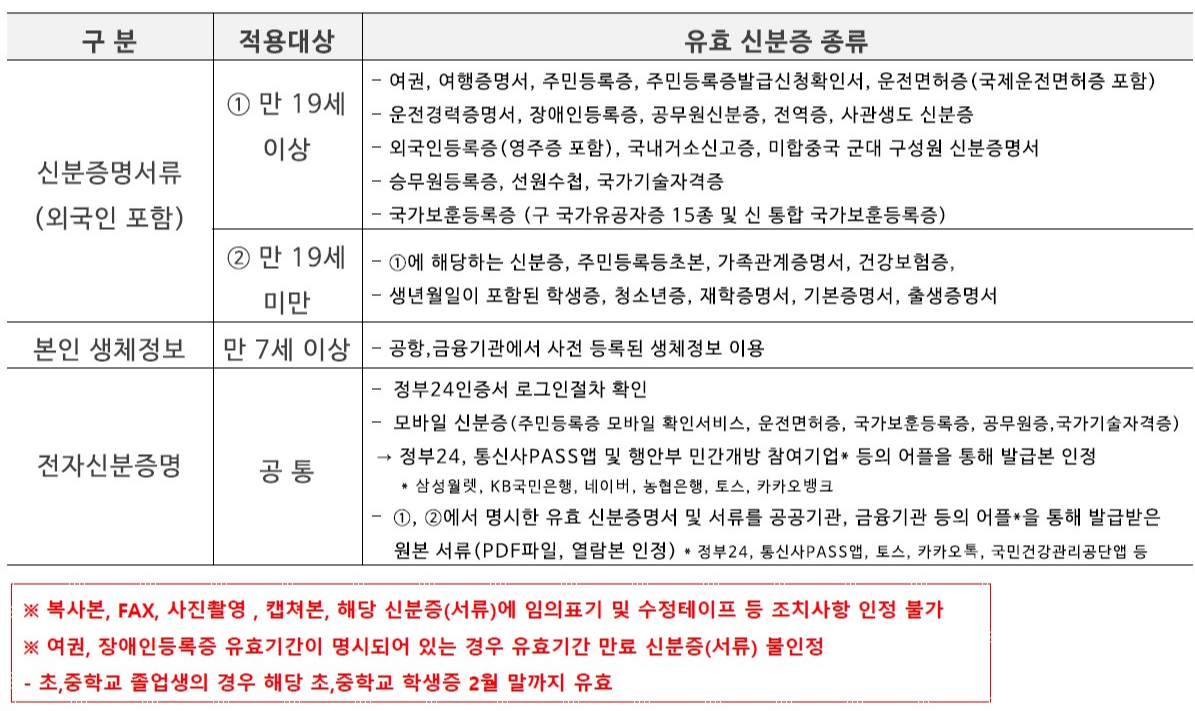 어린이(만 14세 미만)의 경우에는 주민등록표 등·초본, 가족관계증명서, 건강보험증 등으로 신분 확인을 합니다. 모든 신분증명서는 원본을 가지고 와야하고 복사본이나 사진촬영본, 유효기간이 만료된 신분증은 서류는 인정되지 않습니다.