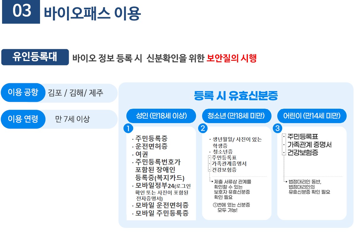 만 18세 미만 미성년자 역시 같은 서류가 필요하며, 법정대리인의 동반과 신분증 확인이 필수입니다. 다만, 사진과 생년월일이 포함된 학생증이나 청소년증을 소지한 경우에는 혼자서도 등록이 가능합니다. 또한, 만 14세 이상부터 18세 미만의 미성년자는 본인 명의의 휴대폰과 여권을 가지고 있을 경우 공항 셀프등록대에서 바이오정보 등록이 가능한데, 다만 인천공항에서는 이 서비스가 제공되지 않으니 참고해야 합니다.