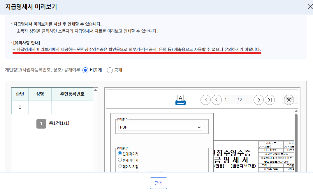 마지막으로 개인정보(사업자등록번호, 상호) 공개 여부를 선택하고 내용을 확인한 후 인쇄 버튼을 클릭합니다. 미리보기에서 제공하는 원천징수영수증을 인쇄할 경우 외부 기관 제출용으로 사용할 수 없으니 꼭 인쇄 버튼을 클릭하시기 바랍니다.
