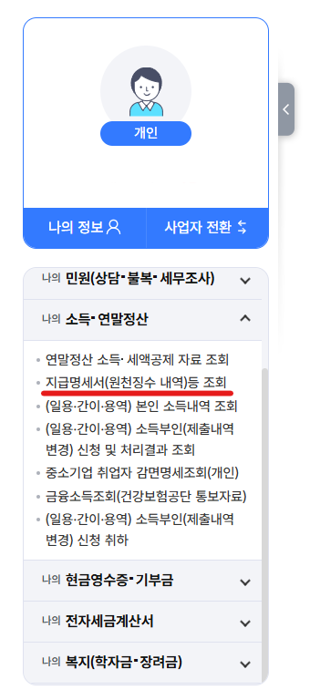 다음으로는 홈페이지 상단의 "나의 홈택스"를 클릭합니다. 그 후 좌측을 보면 [나의 소득·연말정산]-[지급명세서·원천징수영수증 내역] 메뉴를 클릭합니다.