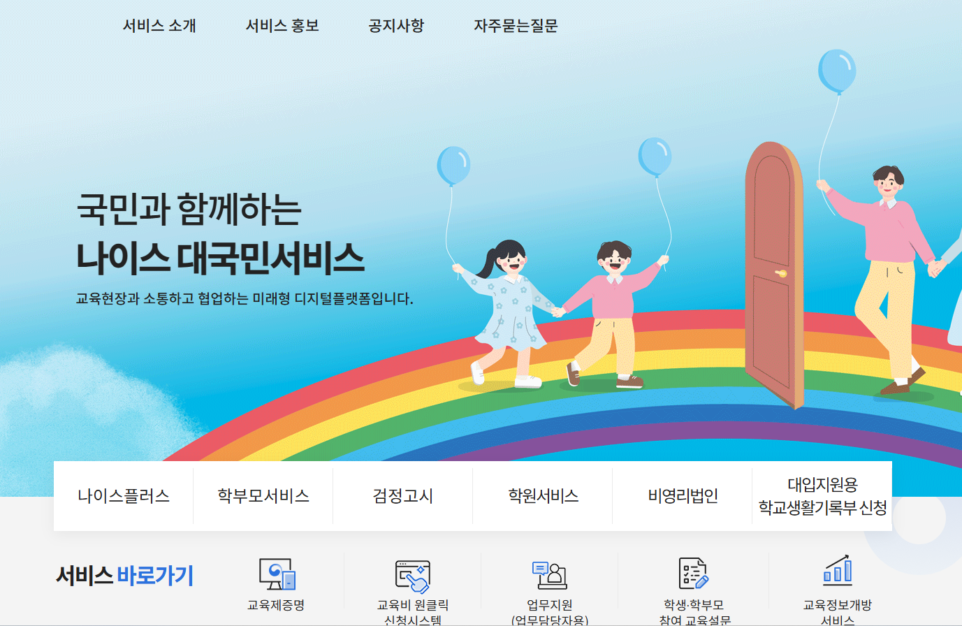포털에 나이스 대국민서비스 검색 후 홈페이지에 접속합니다.