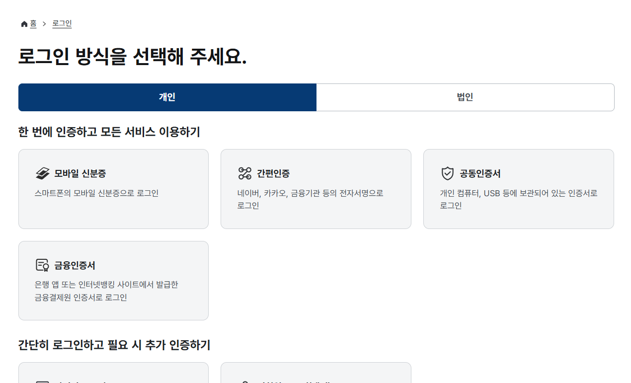 회원이 아니더라도 비회원 신청을 통해 발급이 가능하며, 약관 동의 후 공동인증서 또는 간편인증으로 본인 확인을 진행합니다. (비회원 또한 필요 시 본인인증을 해야할 수 있습니다)
