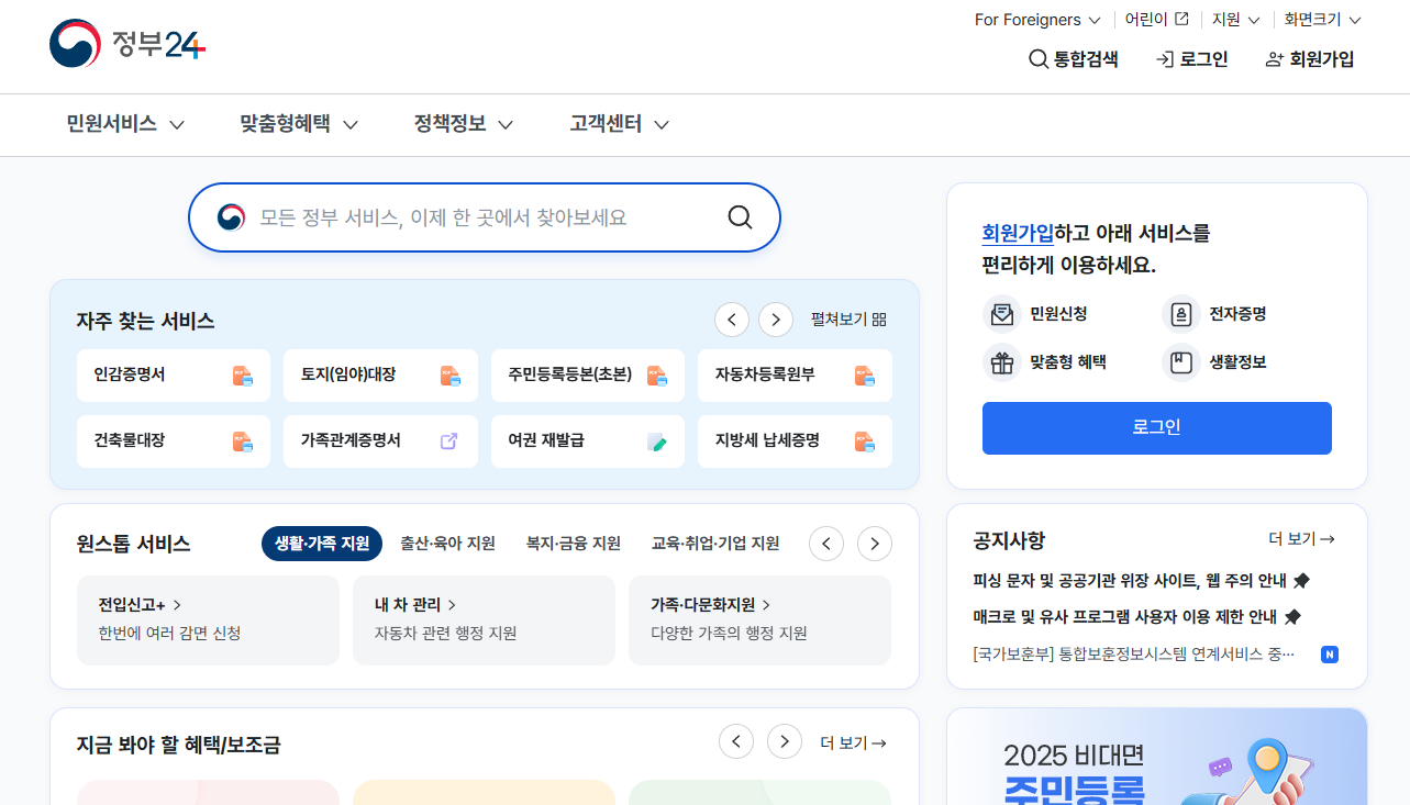 정부24는 정부의 민원 서비스, 정부혜택(보조금24), 정책정보/기관정보 등을 한 곳에서 한 눈에 찾을 수 있고 각 기관의 주요 서비스를 신청·조회·발급할 수 있는 대한민국 정부 대표 포털입니다
