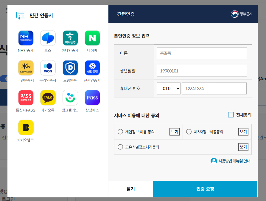 본인인증을 위해 공인인증서 또는 간편인증을 통해 로그인합니다. 참고로 저는 간편인증이 편해서 주로 간편인증을 사용합니다.