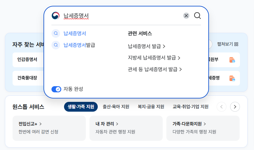 먼저, 정부24 홈페이지에 접속 후 상단 검색창에 '납세증명서'라고 검색합니다.