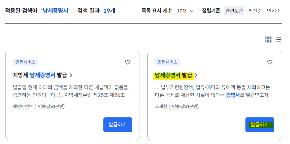 검색결과에서 '납세증명서' 발급하기를 클릭합니다.