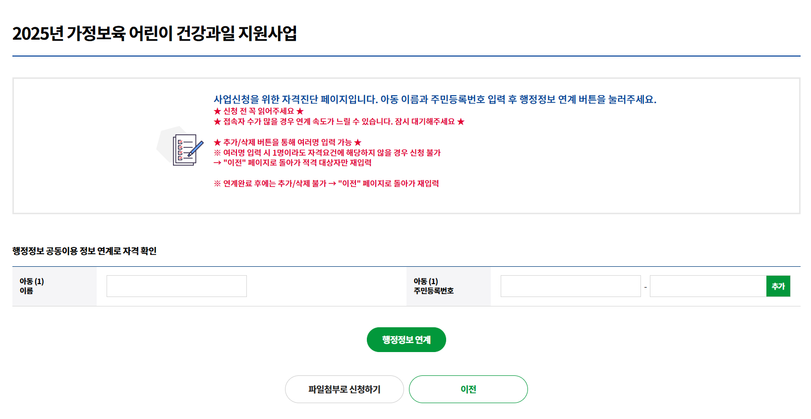 ※ 어린이집이나 유치원 등 시설을 다니는 경우에는 본 사업 지원대상에서 제외되므로 주의하셔야 합니다.