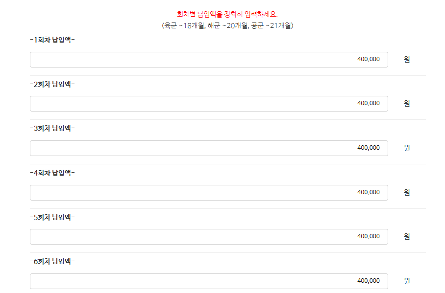 그다음 회차별로 얼마씩 넣었는지 확인합니다. 예를 들어 40만원씩 넣었다가 55만원씩 넣었다면 그 회차 금액을 수정해주세요.