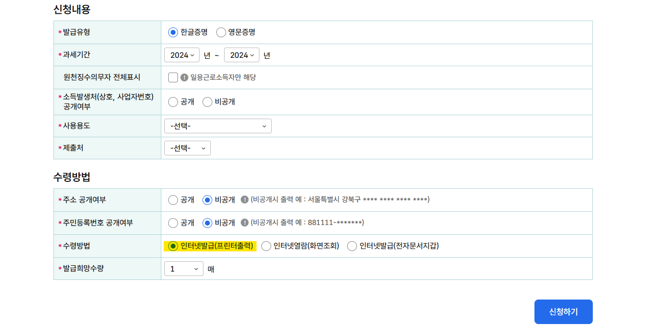수령 방법은 ‘인터넷 출력’으로 선택하시길 바랍니다.