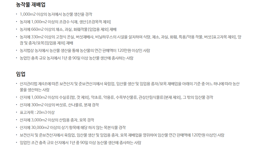 | 영농종사기간 | -해당 시, 군에서 연속 1년(또는 경기도 내 연속 3년)이상 농산물 생산 활동에 실제 종사 경기도 내 연속 3년 이상: 해당 시 , 군 기준, 연접 시, 군(다른 시, 도의 시, 군)포함 *영농규모는 해당 시, 군에서 연속 1년(또는 경기도 내 연속 3년)이상 농민기준을 충족을 전제로 함. 즉 농민의 범위 또한 연속하여 해당 기간을 충족하여야 함 *단, 2023년도 연접 시, 군으로 지급받은자가 제외되지 않도록 예외적으로 지급 가능 |